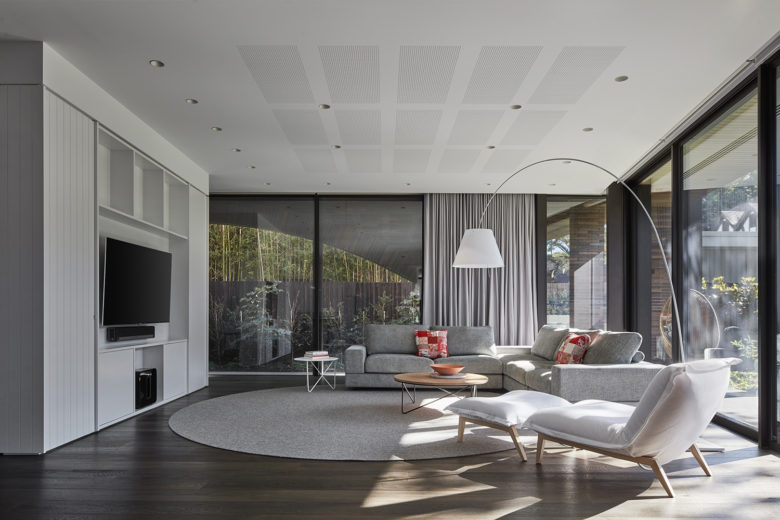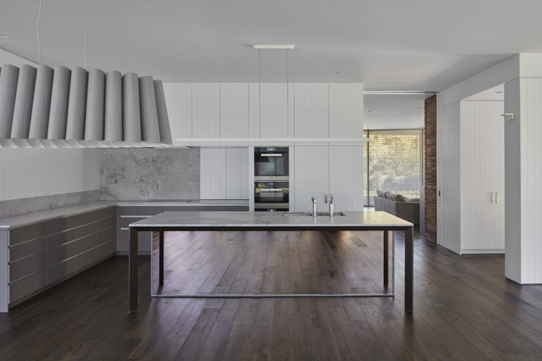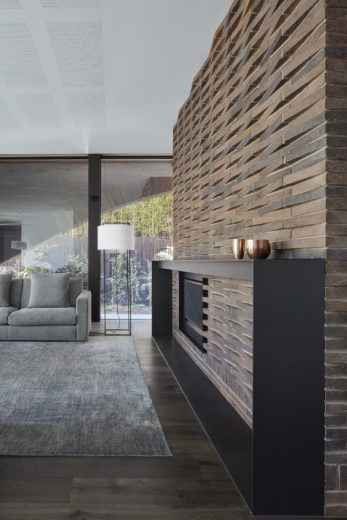 The materials of the Armadale Tree House responds to some of the heritage Old English Tudor homes nearby. It uses red-brown elongated bricks, bronze coloured metals, grey timbers, and slate dual hipped roof. A brick arch echoes the past. The intricacy of the detailing continues inside the house but in a brighter palette of white perforated metal and white painted timber battens. This is a well-used warm family home of great Architectural, Interior Design and Landscape Design sensitivity.