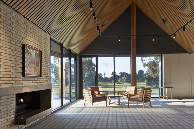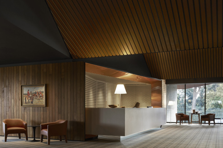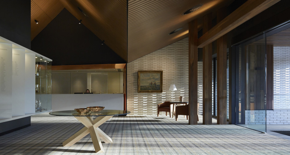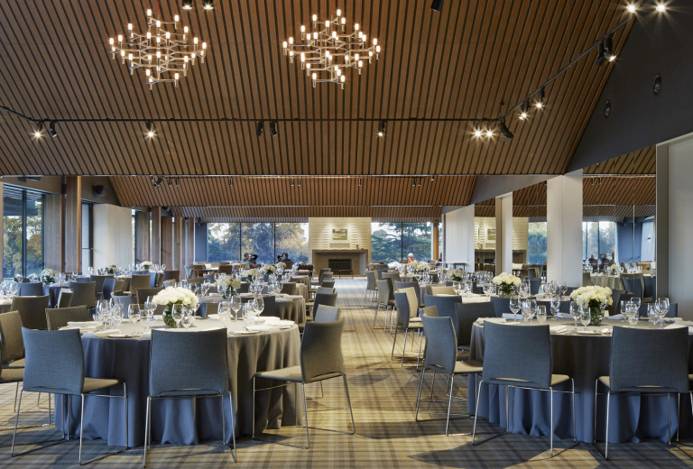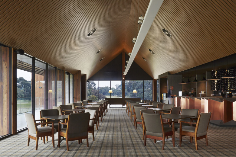 As a reference to the terra cotta tiled gables of the original Clubhouse the new building features a roof of asymmetrical gables of varying pitches. The roof line carries on internally via undulating ceilings of acoustic timber linings. The peaks and troughs of the ceilings have been strategically used to link all of the spaces as well as to promote feelings of loftiness or cosiness. The palette of materials is a direct response to the beauty of the outside course. Dark bronze, reclaimed cypress timber, charcoal walls and copper highlights are finishes used throughout. The interiors of the Huntingdale Golf Club were designed with the golf and landscape as an ever changing back drop. The plaid carpet and white bricks both sit comfortably with the modern interior but reference the past.