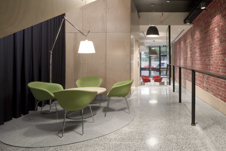 The design philosophy for the Meerkin & Apel Lawyers Office has been one of exploring alternative accommodation options for traditional business functions. Our client, a medium sized firm of lawyers, sought an environment which challenged the standard model of overly refined office accommodation, something which would set them apart from similar businesses. Accommodation includes, at the ground level, extensive off street parking at the rear and reception via the shop front. The 3 level top lit stair void leads up to the main office floor.
