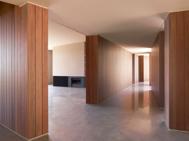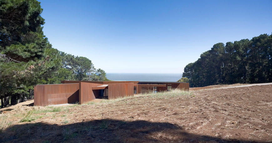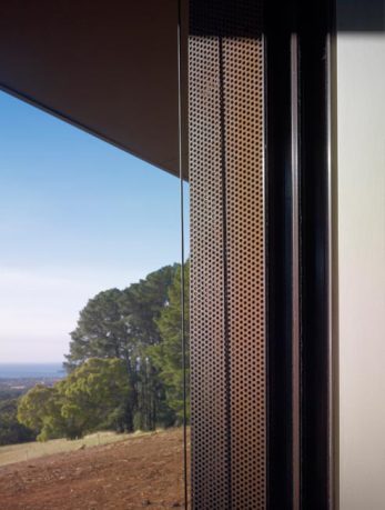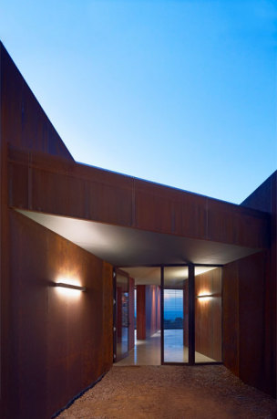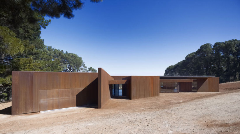 The Red Hill House represents the adventurous spirit of the Australian weekender, albeit with a little more discreet comfort. The building sits within a paddock defined by rows of pine windbreaks. The view is world class, serene and bucolic on the one hand yet ever changing when looking towards Port Philip Bay and passing ships. The Red Hill House plan is a linear arrangement of spaces emanating radially from a central hub. The long kinked and fragmented plan allows for a variety of daylight and views in every room. The linear plan results in a long and low angular building form which is nestled into the contours of the hill. From a distance the rusted steel cladding appears solid, closer inspection reveals a transparent veil of perforations. The uniformity of the cladding and the jagged composition of walls and roof suggest house as sculpture, something timeless, non-utilitarian and something which will preserve the excitement generated by this site. Red Hill has become a rural and coastal retreat for Melbourne’s well-heeled who wish to escape their urban existence. Increasingly big budget homes carry their urban sameness to the countryside and overwhelm the delicacy of experience to which the occupants retreat. Red House demonstrates that the experience can be enjoyed and augmented in an artistic manner while at the same time satisfying the demand of modern housing must haves, a weekender that works.