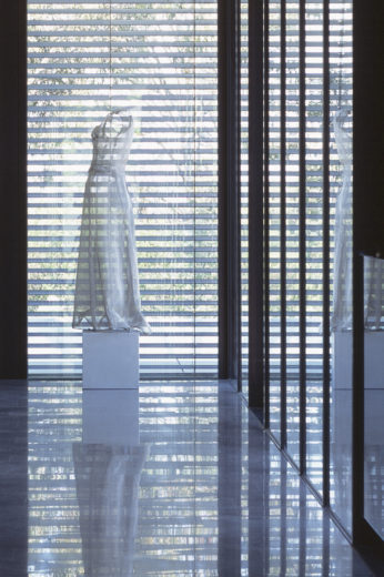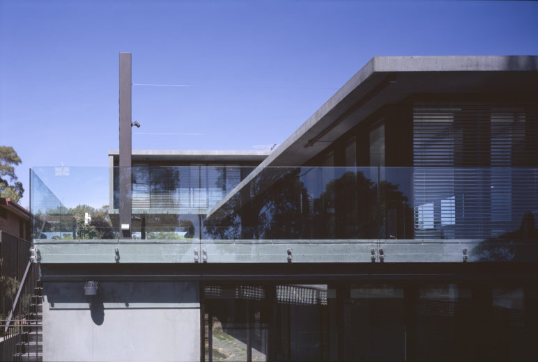 Meanwhile, the middle level is aligned to maximise north light and to look out towards the west, the topmost level provides views of the city. Green-grey concrete is used for the landscaping, walls and floor slabs, as well as the roofs that are covered in crushed bluestone rocks. The dark bronze metal components, glass, continuous external blinds and frameless balustrades form simple, serene planes that contrast with the tension created by the misalignment of the three levels and the placement of the top level on six slender columns.